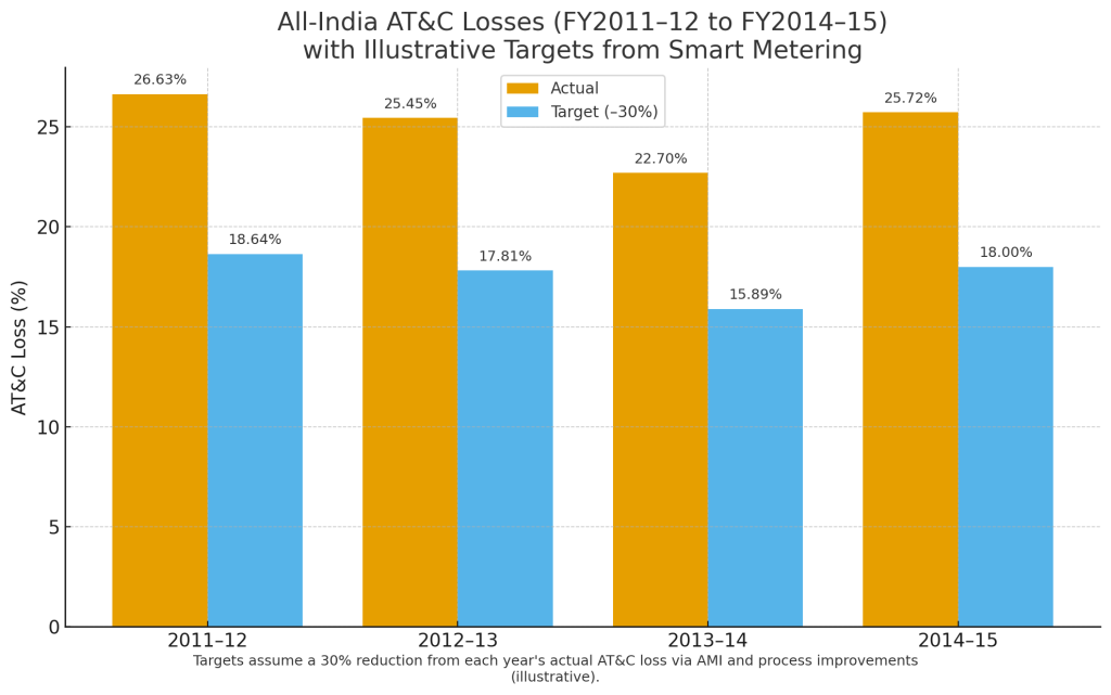AT&C losses 2012–2015 on the left; adjacent bars showing target cuts with smart metering