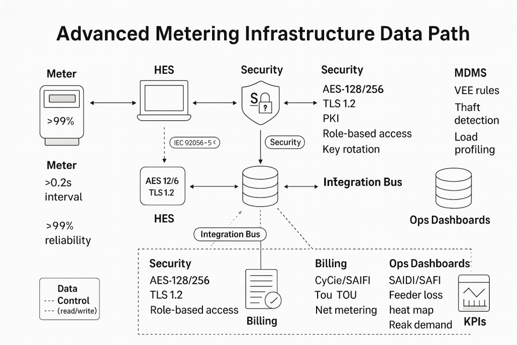- A Meter Data Management System (MDMS) that sanity-checks the numbers, reconciles gaps, and hands clean data to billing and analytics.