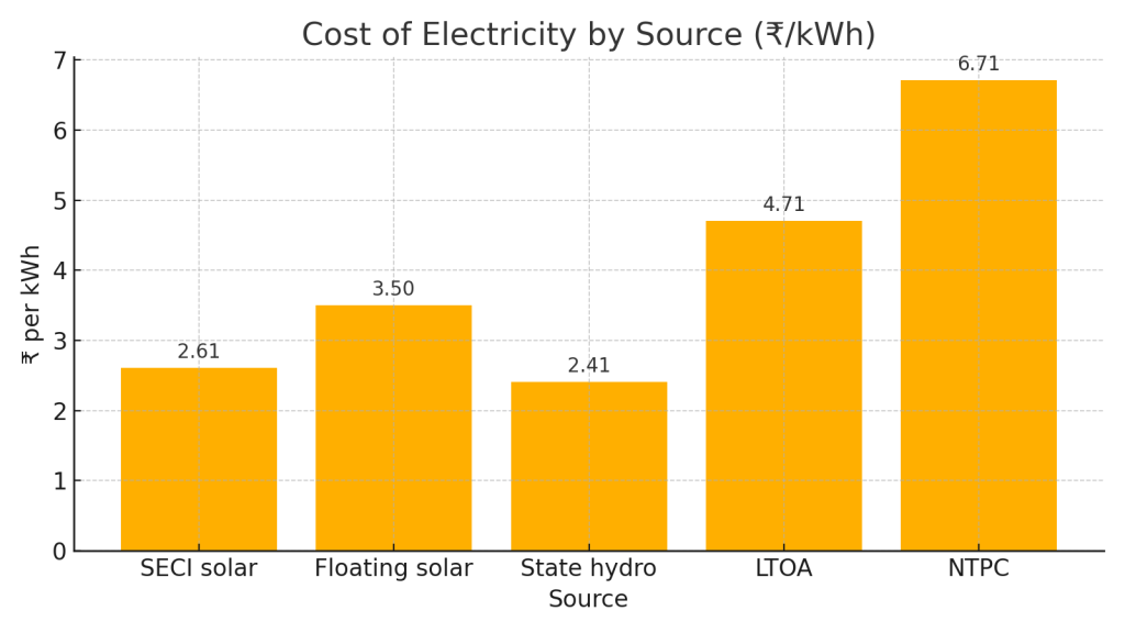 - Cost stack today: : Local clean power is cheaper than much of what we buy.SECI solar ~₹2.61/kWh; floating solar ~₹3.50; state hydro ~₹2.41—all cheaper than average LTOA (~₹4.71), with some central allocations even higher (e.g., NTPC ~₹6.71). That’s why the plan centers 500 MW of state‑owned RE by 2030.