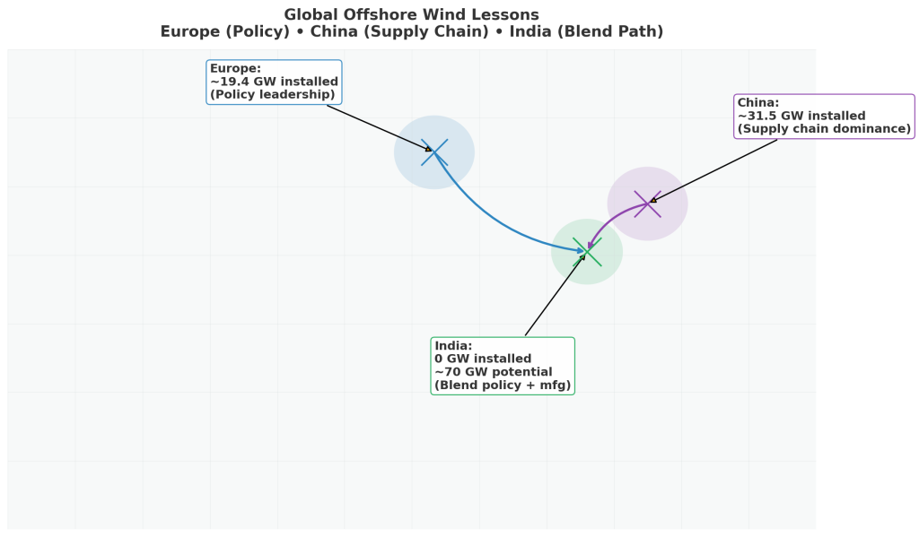 • Europe’s lesson: Strong initial subsidies and predictable auctions built mature markets. Today, offshore wind competes on cost.