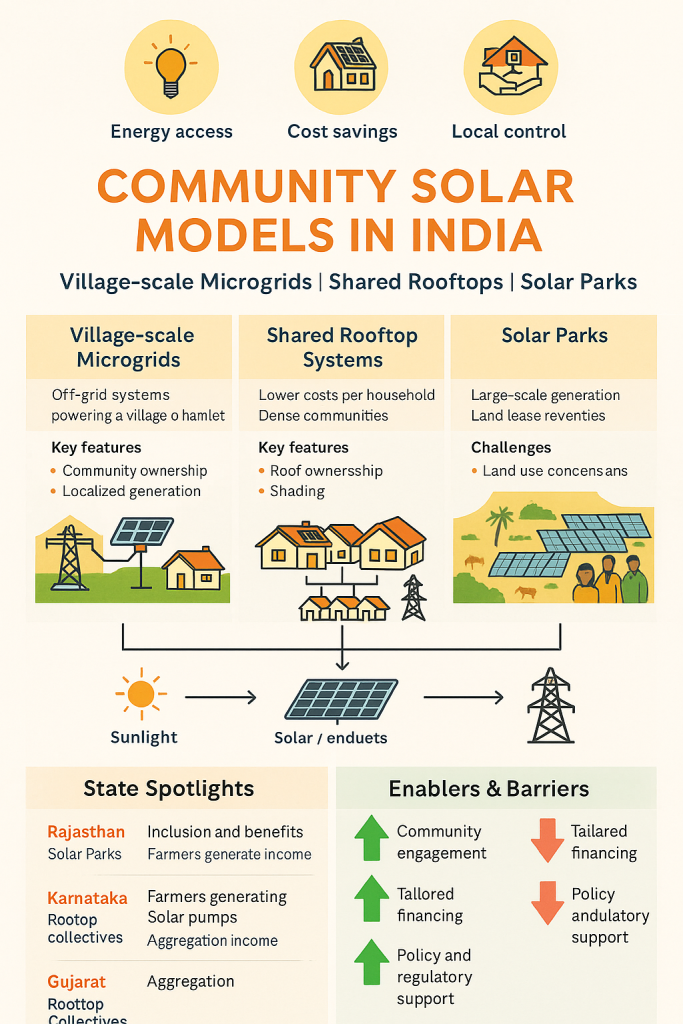 different Indian community solar models (village-level microgrids, shared rooftop systems, solar parks