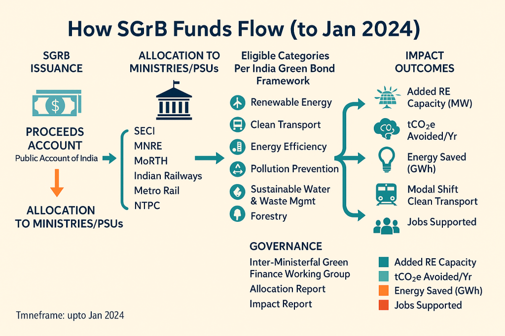 Those first two tranches of SGrBs, floated in January and February 2024, mark a quiet turning point. For the first time, the Indian government is using debt to fund projects with measurable environmental outcomes — solar parks, clean-transport corridors, afforestation drives.