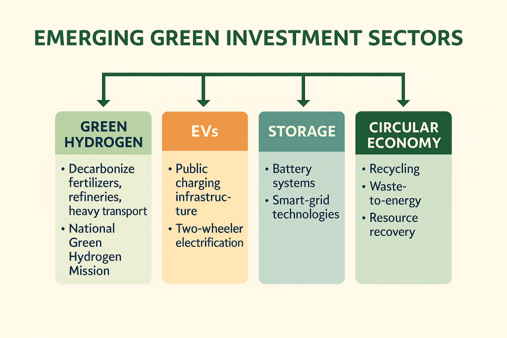 - Green Hydrogen: nearly ₹8 lakh crore in potential investment by 2030, key to decarbonising steel, fertiliser, and heavy transport.