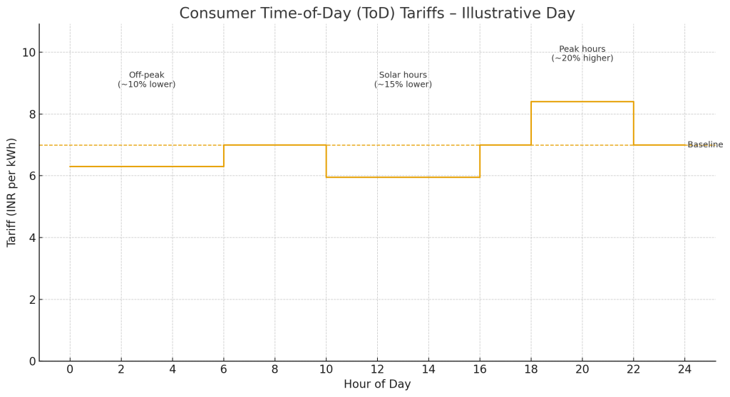 The policy promises reliable, 24/7 power for all citizens. A nationwide Time-of-Day (ToD) tariff for all consumers (except farmers) will reduce rates during solar hours by 10–20% and increase rates during peak hours.