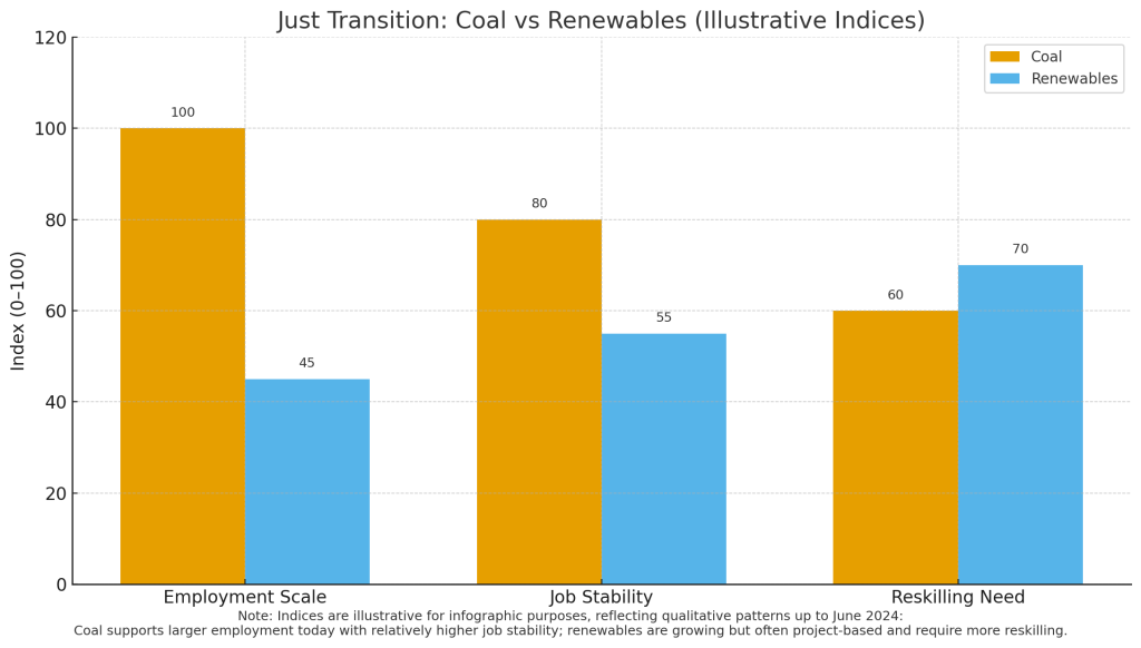 Coal remains a major source of employment, with over 1.4 million livelihoods directly and indirectly dependent on it. Renewable energy jobs, though growing, are often temporary and lower-paying.